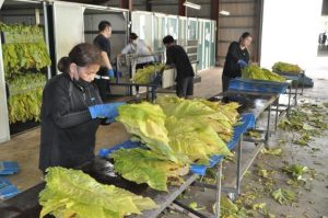 これから収穫作業が本格化する今期の葉タバコは年明けからの天候の崩れが生育に影響した。現在は下部の下葉の収穫作業が進み、本葉の収穫に移っている。5月中旬ごろに収穫のピークを迎える。各地にある共同乾燥施設には農家が持ち込んだ葉タバコの束がずらりと並び、作業員らが手際よく乾燥機につり下げる作業に汗を流している。4月末から始まり6月上旬まで続く。