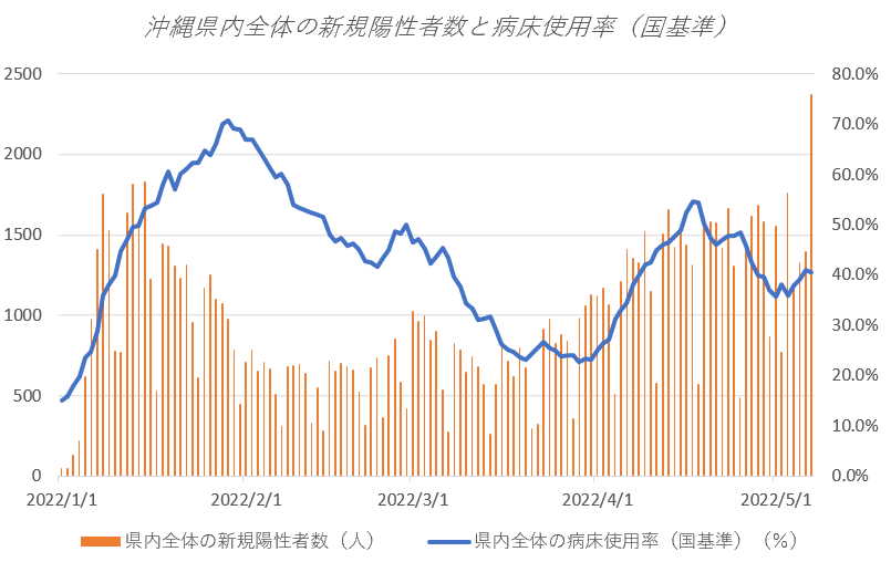 沖縄県内全体の病床使用率(国基準)40.6%、新規PCR検査の陽性率(直近1週間平均)20.3%