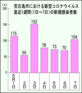宮古島市で新型コロナウイルス新規感染者数の拡大傾向がみられ、7日までの直近1週間で647人が陽性と確認された。3日には152人の過去最多を更新するなど100人超は3日間。1日当たりの平均感染者数は92・4人に達した。前の週(4月24~30日)の495人と比較すると感染者数で152人、1日当たりの平均で21・7人それぞれ上回っている。
