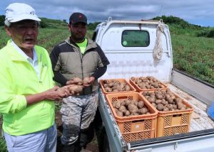 城辺の保良の畑で試験栽培が行われてきたポテトチップスに加工するジャガイモの収穫が7日から始まった。このジャガイモは、スナック菓子を製造、販売している湖池屋(本社、東京都板橋区)のポテトチップス用で、10日に出荷を予定している。