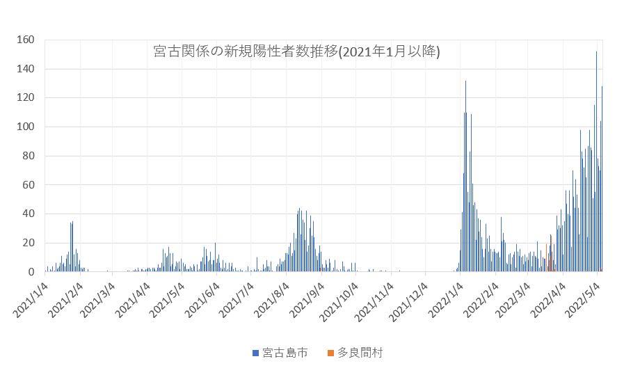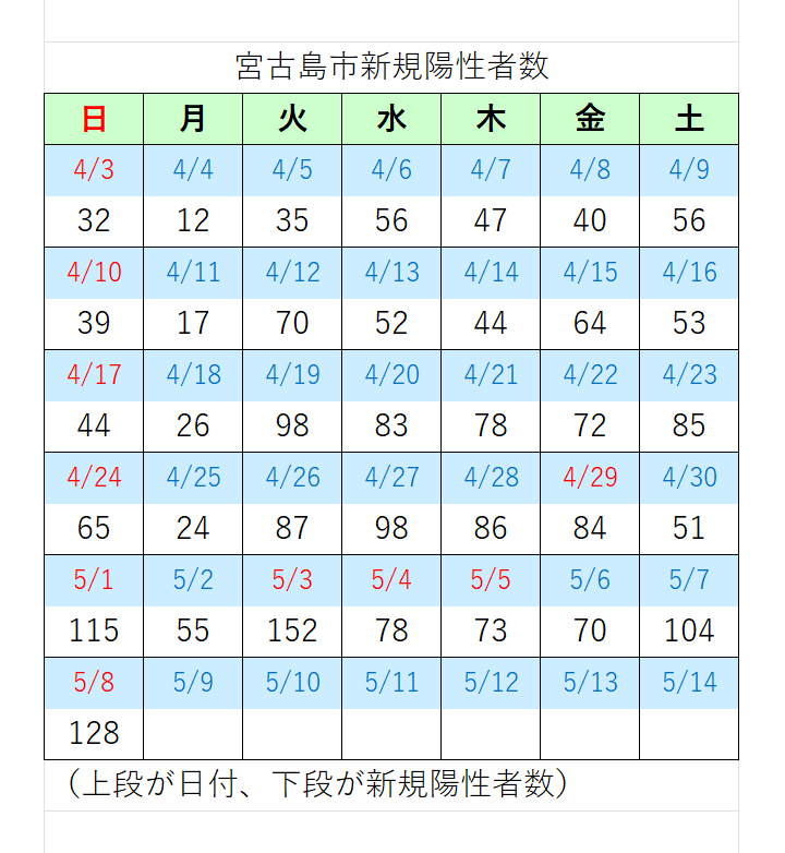 【那覇支社】沖縄県は8日、宮古島市で前週から13人増となる128人が新たに新型コロナウイルスに感染し、宮古地区の病床使用率は前日から18.2ポイント上昇の37.9%となったと発表した。病床使用率が30%を超えるのは2月20日(30.3%)以来約2か月半ぶり。県は、医療機関で多くの陽性者が確認されていることが影響しているとした。