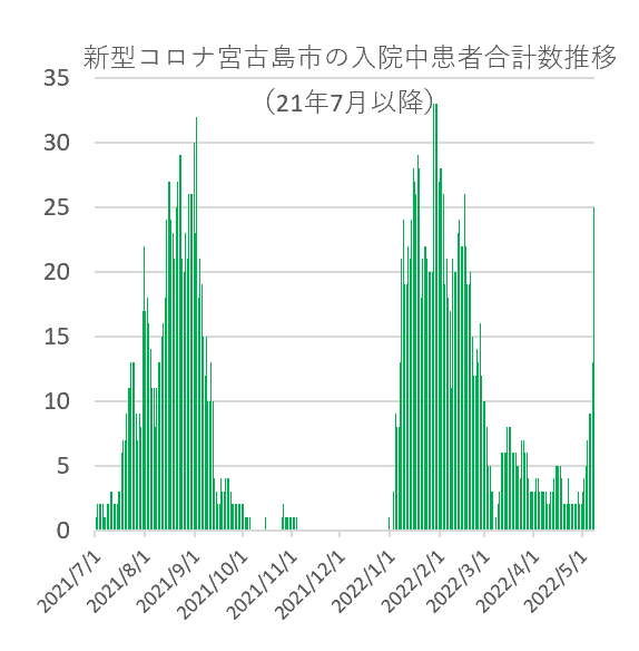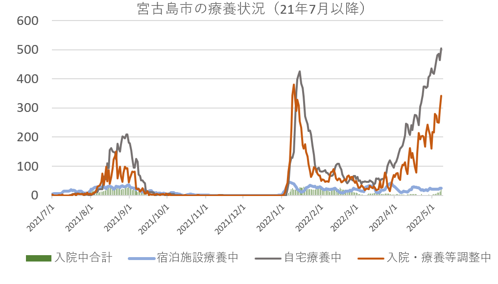 市内での療養者数は896人となり、2日連続で過去最多を更新した。入院中の患者は宮古病院の9人(中等症のみ)、民間病院の16人(軽症のみ)の計25人。そのほか、宿泊施設療養中が25人、自宅療養中が504人、入院・療養等調整中が342人だった。