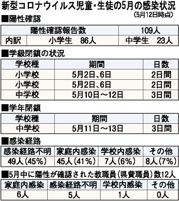 5月中に新型コロナ陽性が確認された教職員(県費職員)数は12人で、感染経路は家庭内感染が6人、感染経路不明が5人、学校内感染が1人だった。