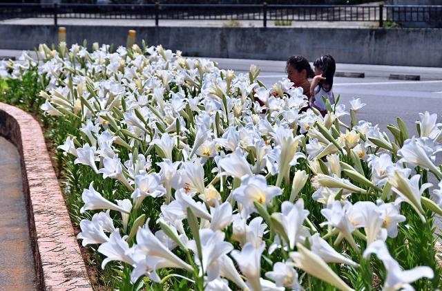 梅雨真っただ中の宮古島。久しぶりに太陽の光が降り注いだ12日、パイナガマ海空すこやか公園の駐車場では、花壇のテッポウユリが咲き誇り、訪れた人たちの目を楽しませた。