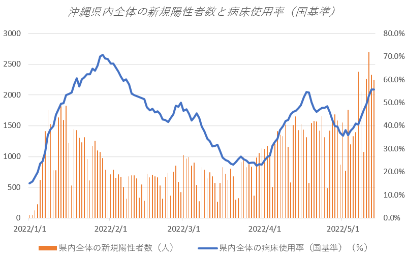 沖縄県内全体の病床使用率(国基準)55.6%。新規PCR検査の陽性率(直近1週間平均)22.4%