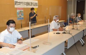 県が「コロナ感染拡大警報」を発出したことを受け、座喜味一幸市長と宮古病院長ら医療関係者は13日、市役所でそろって会見し、感染が急拡大し医療体制がひっ迫していることから、「これまで以上の感染対策の徹底を」と市民に呼び掛けた。