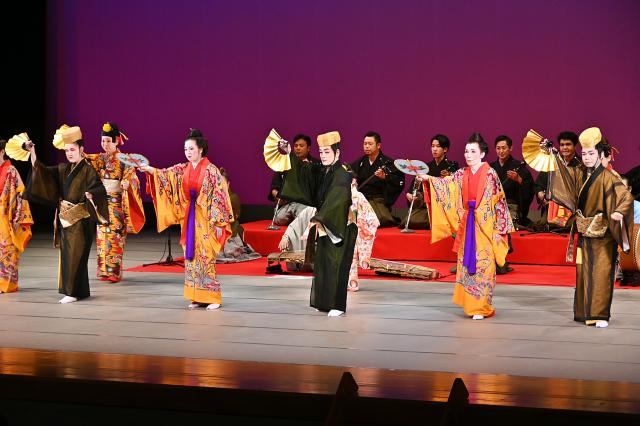 第1部の最初の演目では、前里博美琉舞練場、県立芸大OB有志の会が「かぎやで風」を披露。華やかな衣装と舞いで公演を盛り上げた。