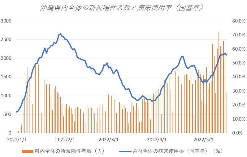 沖縄県内全体の病床使用率(国基準)55.8%。新規PCR検査の陽性率(直近1週間平均)21.6%。