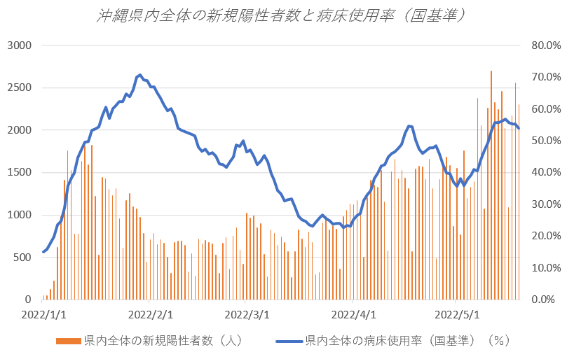 沖縄県内全体の病床使用率(国基準)54.0%。新規PCR検査の陽性率(直近1週間平均)20.6%。