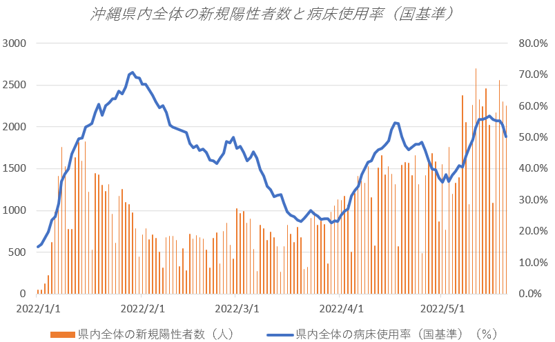 沖縄県内全体の病床使用率(国基準)50.1%。新規PCR検査の陽性率(直近1週間平均)20.0%。