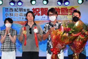 スキージャンプ界の「レジェンド」と称される葛西紀明選手が率いる土屋ホームスキー部「チーム土屋」の小林陵侑選手が北京冬季五輪で金メダルと銀メダルを獲得したことを祝うとともに、チームのさらなる活躍を祈念する祝賀会・激励会(主催・宮古島ビーチバレー連盟)が21日、市内の飲食店で開かれた。小林選手は宮古島でのトレーニングがメダルにつながったとの思いを示し、引き続いての応援を呼び掛けた。