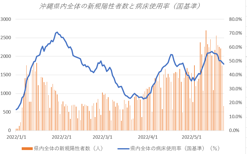 沖縄県内全体の病床使用率(国基準)47.7%。新規PCR検査の陽性率(直近1週間平均)18.0%