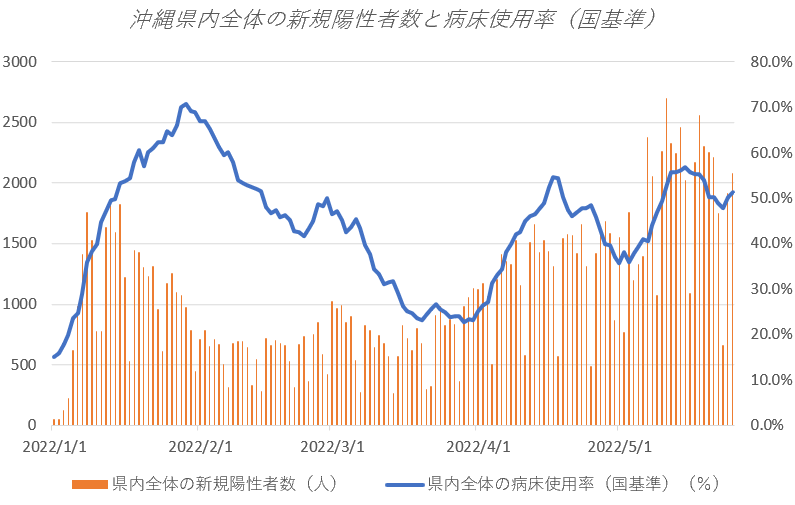 沖縄県内全体の病床使用率(国基準)51.2%。新規PCR検査の陽性率(直近1週間平均)17.7%
