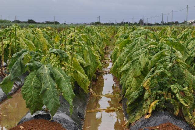 年明けから天候不良が続く中、今期の葉タバコ生産は厳しい状況になっている。2月の日照不足で茎が伸びず、葉の枚数も例年の半分ほどしかなく、収量は大幅減となりそうだ。天候不良続きで畝間に雨水がたまることで、雨水から菌が葉にうつり、表面を白化させる疫病が発生している畑もあり、農家にとっては痛手だ。
