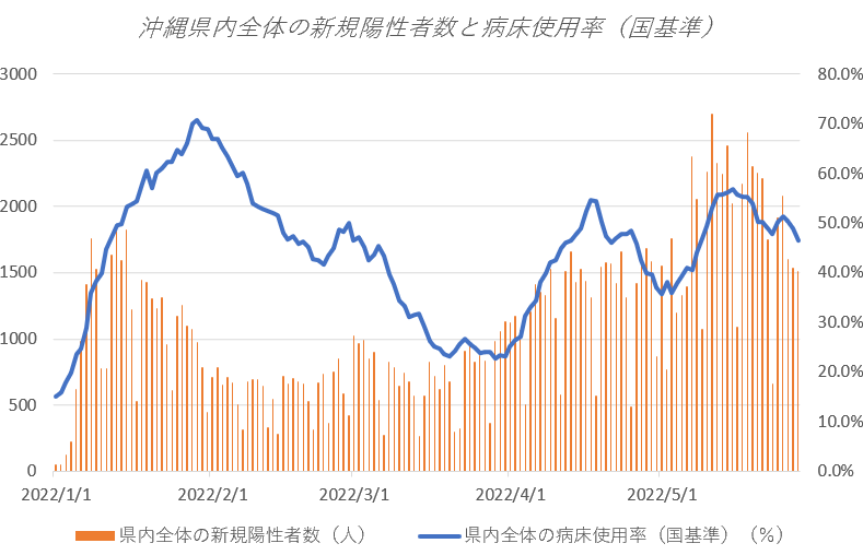 沖縄県内全体の病床使用率(国基準)46.5%。新規PCR検査の陽性率(直近1週間平均)16.3%。