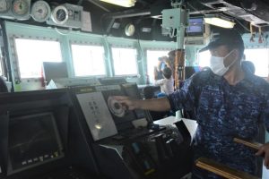 同艦は全長65㍍、幅12㍍、速力は15ノット。隊員は46~48人が乗船しており、宮古島近海での任務を終え、隊員の休養と島内の岸壁調査を兼ねて入港した。