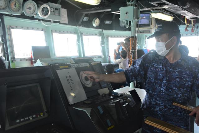 海上自衛隊の多用途支援艦「あまくさ」(山下保博艦長)の特別公開が28日、参加者を限定して平良港で開かれた。参加者は隊員らの案内で艦内を見学し、設備や訓練内容などの説明を受け、興味深そうに聞き入っていた。