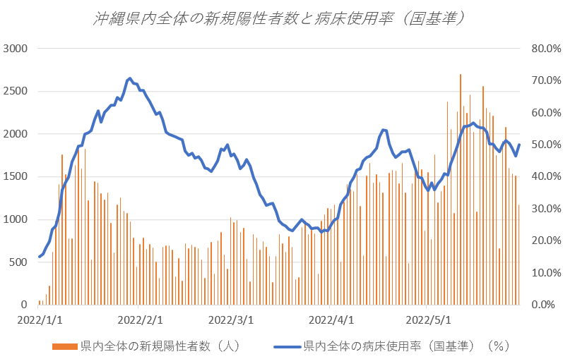 沖縄県内全体の病床使用率(国基準)49.9%。新規PCR検査の陽性率(直近1週間平均)16.2%。