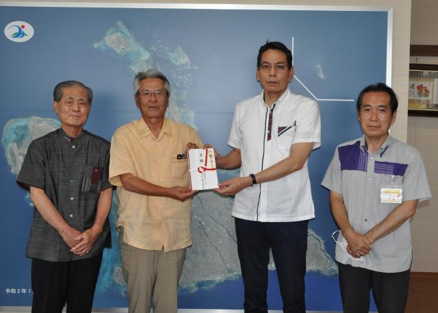 県内スーパー最大手のサンエーは宮古空港東側に大型店舗「宮古島シティ」がオープンするのを前に宮古島市に300万円を寄付した。30日、新城健太郎社長らが市役所を訪れ、座喜味一幸市長に手渡した。宮古島シティは島内最大規模のショッピングタウンで6月17日にオープンする。