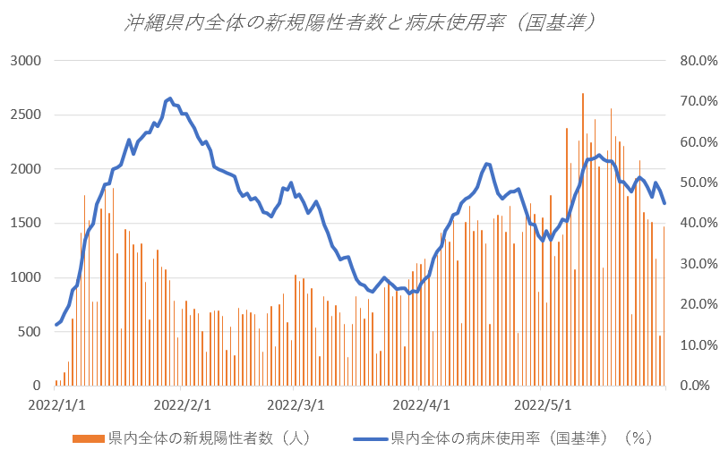 沖縄県内全体の病床使用率(国基準)44.9%。新規PCR検査の陽性率(直近1週間平均)17.9%。