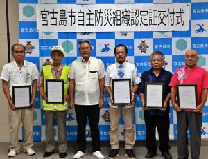 「自分たちの地域は自分たちで守る」を掲げて組織された市内の自主防災組織5団体に対する宮古島市としては初の認定証交付式が1日、市役所で行われた。式では座喜味一幸市長からそれぞれの団体の代表に認定証が手渡された。市と認定された5団体は安全安心で住みよい地域づくりに向けてさらなる連携強化を図るとしている。