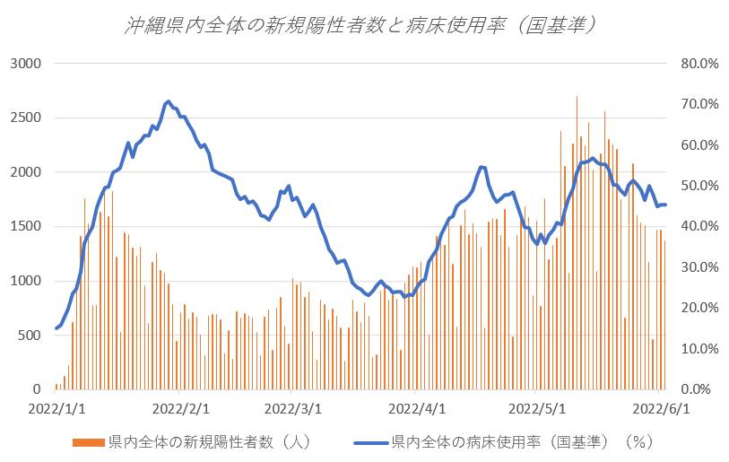 沖縄県内全体の病床使用率(国基準)45.3%。新規PCR検査の陽性率(直近1週間平均)17.1%。