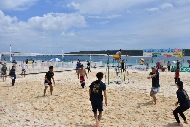 宮古島ビーチバレー大会2022(主催・宮古島ビーチバレー連盟)が4日、下地の与那覇前浜ビーチで開幕した。男女混成4人制に45チームが出場し、予選グループ戦を行った。選手たちは仲間と共に勝利を目指し、砂浜で熱い戦いを繰り広げた。最終日の5日は決勝トーナメントが行われる。