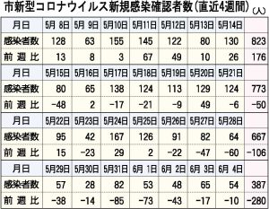 市は4日、市内での直近4週間の新型コロナウイルス新規感染確認者数を発表した。それによると5月29日から6月4日までの1週間の感染者数は387人となり前週比で280人の大幅減となった。前週の人数を下回るのは3週間連続で、300人台となるのは7週間ぶり。過去最多となっている5月8日から14日までの週と比較すると半分以下になるなど感染者数には減少傾向が見られるようになってきている。