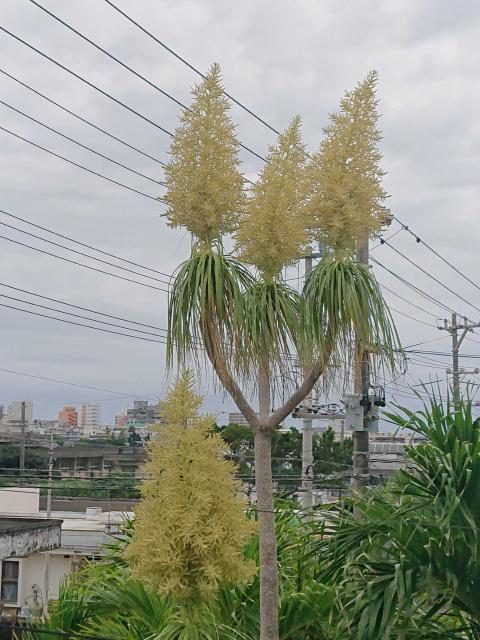 数十年に一度しか咲かないといわれるトックリランが、平良の民家の庭で黄金色の花を咲かせ、道行く人たちの目を楽しませている。高さ5~6㍍の幹の先端に、円すい形の四つの花が咲き、遠くからも眺めることができる。