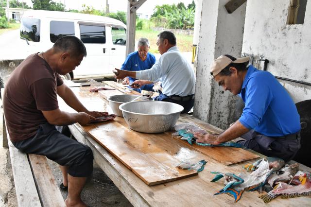 【多良間】多良間島の伝統行事「スツウプナカ」が8日、村内4カ所の祭場で行われる。このうち、北海人座は午前中から漁を行い、神様にささげるための魚を若いススキの葉で編んだ綱をえらから口に通し数匹をひとまとめにする作業を行った。また、クバン座では、海人座が捕った魚を調理するなど準備を整えた。