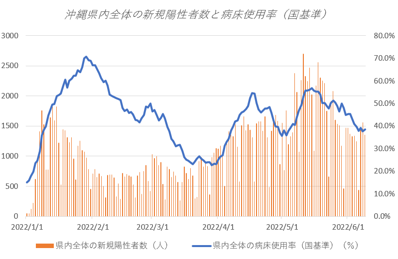 沖縄県内全体の病床使用率(国基準)38.6%。新規PCR検査の陽性率(直近1週間平均)17.1%