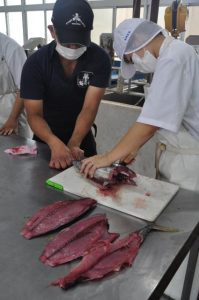 宮古総合実業高校(大山正吾校長)で9日、マグロの調理実習が行われた。食と環境科フードクリエイトコースの2年生が包丁でさばく技術や、食材を大切に扱う知識などを学んだ。