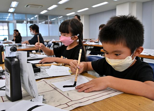 はがき筆文字の楽しさに触れ、仕上げた作品を「第6回全国はがき筆文字展」に出品することを目指した「はがき筆文字教室」が12日、平良港ターミナルビルで行われ、参加した16人が「はがき」にそれぞれの思いを込めた文字を筆で書き入れた。