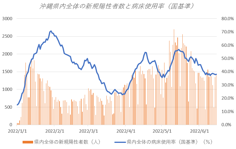沖縄県内全体の病床使用率(国基準)38.1%。新規PCR検査の陽性率(直近1週間平均)14.4%。