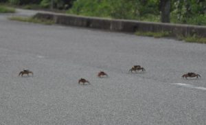 池間島の一周道路では14日、放卵のため海辺を目指して移動するオカガニの姿が観察された。普段は内陸部に生息しているオカガニはこの時期、腹に卵を抱いて放卵のために海辺に移動する。満潮の時刻に合わせるように、卵を抱いたオカガニが道路を横断。時折通る車や自転車などを警戒し、横断の途中、急いで道路脇の茂みに引き返すオカガニも少なくない。以前のように群れで動く姿は確認されず、散発的に動く姿だけだった。