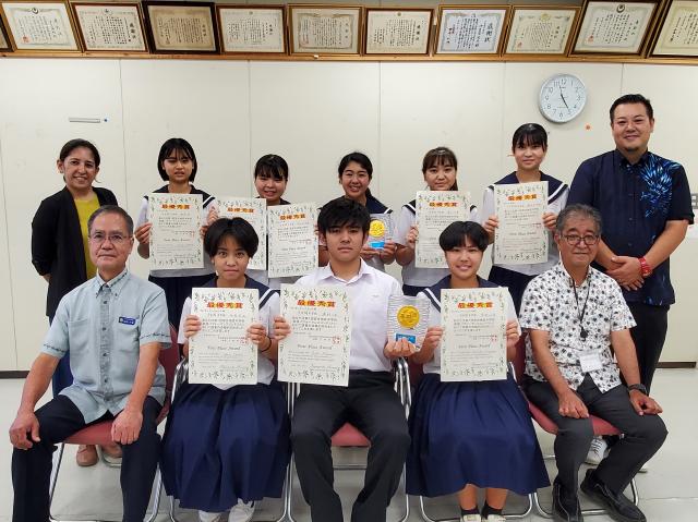 【多良間】11日に開催された宮古地区中学校英語パフォーマンスコンテストでプレゼンテーションとスキットの2部門で最優秀賞を獲得した多良間中学校の生徒が13日、村役場に池城三千雄教育長を訪ね、受賞を報告した。池城教育長は「報告を聞けてうれしい。おめでとう」と喜んだ。