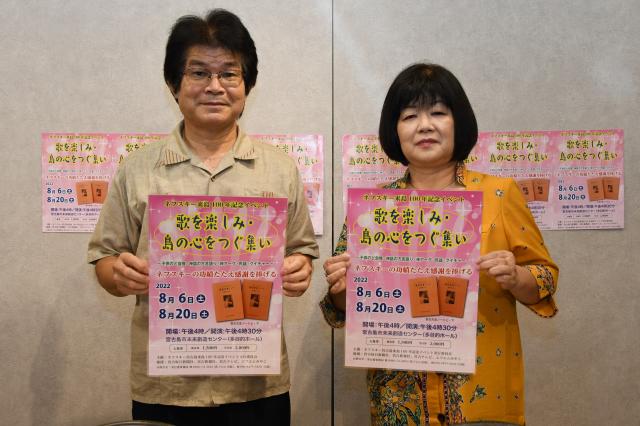 ニコライ・ネフスキー宮古島来島100年を記念したイベント「歌を楽しみ・島の心をつぐ集い」(主催・同イベント実行委員会)が8月6日と同20日に市未来創造センター多目的ホールで開催される。実行委員会の猪子立子会長らが16日、市平良の事務所で会見を開き、イベント開催決定を報告するとともに、イベントの一環として実施する「子供のど自慢大会」への出場者を募集すると発表した。
