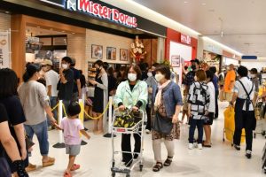 サンエー(本社宜野湾市、新城健太郎社長)の大型ショッピングセンター「サンエー宮古島シティ(久場俊秀総合店長)」がグランドオープンして最初の週末となる18日、開店から多くの市民が訪れ大にぎわいとなった。再出店となるミスタードーナツには長蛇の列ができ、宮古島初出店となる「無印良品」や家電の「エディオン」、ドラッグストアの「マツモトキヨシ」に多くの市民が足を運び、目当ての商品を買い求めた。