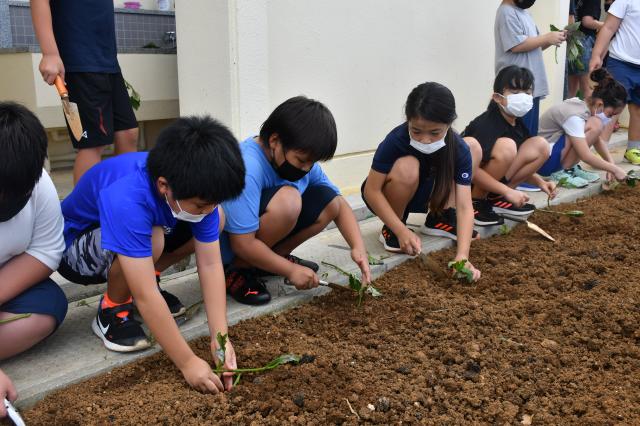 伊良部島小学校(與那覇盛彦校長)の4年生は21日、食育活動の一環として、伝統的野菜ハンダマ(方言名・パルダマ)の植え付けなどを行った。試食会も行われ、児童たちは笑顔でパルダマを使った料理を頬張っていた。地産地消について理解を深めた。