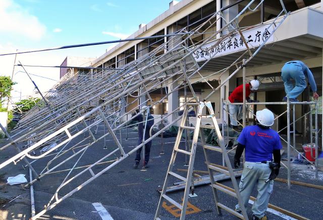 旧平良市の平良第2庁舎解体工事現場の足場が21日午後5時半ごろ、何らかの理由で倒壊した。大きな被害やけが人は無かったが、近くには北小学校もあり、保護者からは不安と、何事もなかったことに対する安堵の声が上がった。