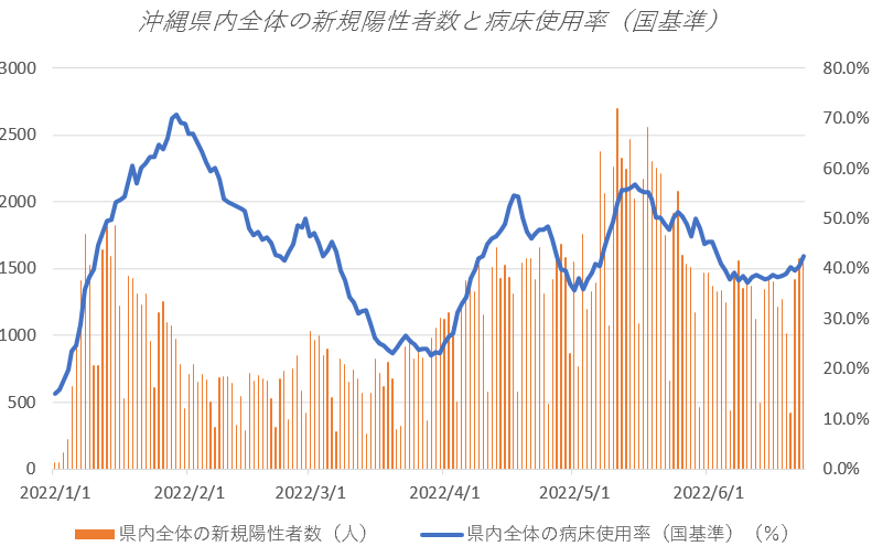 沖縄県内全体の病床使用率(国基準)42.6%。新規PCR検査の陽性率(直近1週間平均)15.0%