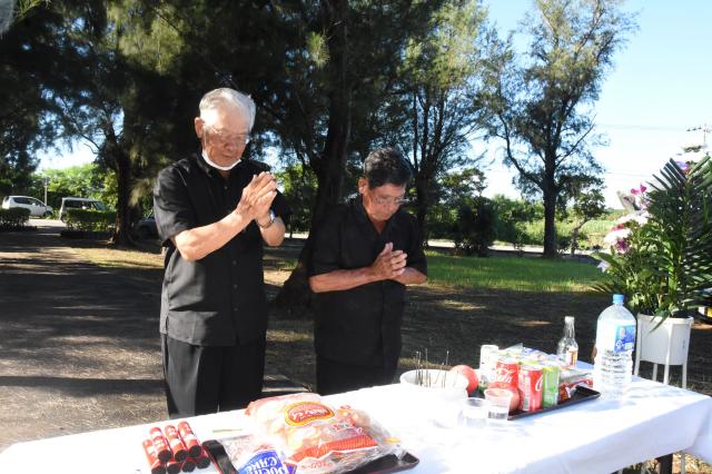 伊良部地区戦没者遺族会(前泊龍英会長)は「慰霊の日」の23日、伊良部字前里添にある慰霊之塔前で第68回戦没者追悼式を行った。昨年に引き続き、新型コロナウイルスの感染状況を踏まえて式典形式では行わず、午前8~10時の間に個人で焼香する形式で行われ、マスク姿の遺族らが戦没者のみ霊を慰め、平和への誓いを新たにした。