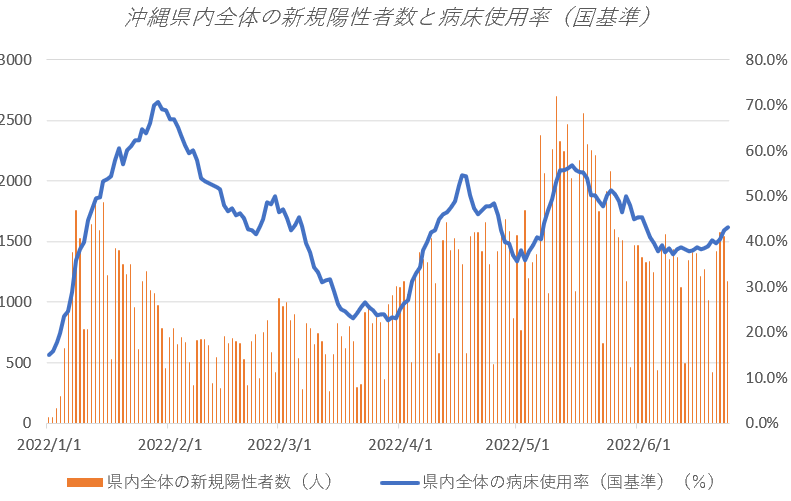 沖縄県内全体の病床使用率(国基準)43.1%。新規PCR検査の陽性率(直近1週間平均)15.2%。