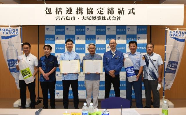 宮古島市と大塚製薬(本社東京都、井上眞社長)の熊本支店(石田清支店長)は24日、市民の健康づくりや健康被害防止、スポーツ振興、災害対策など5項目で包括的に連携する協定を締結した。市役所で同日、締結式が行われ、座喜味一幸市長と石田支店長が協定書を交わした。