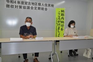 県、宮古島市、多良間村で構成する宮古地区個人住民税徴収対策協議会の総会が24日、市役所であり、課税状況や徴収実績を確認した。協議会の伊川秀樹会長(副市長)は、住民に対し税金の納期内納付への協力を呼び掛けた。