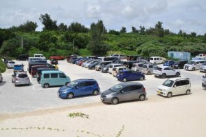 梅雨明け後、気温が30度を超える日が続いているが、強い夏の日差しに誘われるように市内の各ビーチは観光客の若者でにぎわっている。週末となった25日、ビーチの駐車場は終日、満車状態。駐車しているのは、観光客が利用する「わ」「れ」ナンバーのレンタカーがほとんどだった。