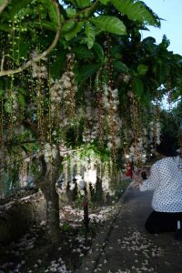 平良添道にあるサガリバナ群生地を夜間ライトアップする「添道サガリバナ夜のお花見」(主催・宮古島環境クラブ)が25日から始まった。明かりに照らされた幻想的な美しさで夜を彩るサガリバナを一目見ようと、初日から多くの市民らが訪れた。期間は7月4日までで、時間は午後7時30分から同9時30分。