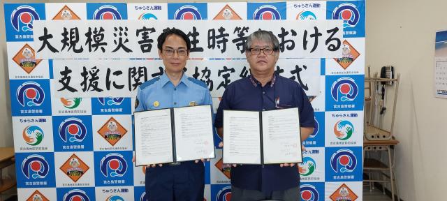 災害発生時の警察活動の強化、維持を目的に宮古島警察署(仲宗根宗信署長)と宮古自動車学校(上地成人社長)は27日、「大規模災害発生時等における支援に関する協定」を締結した。締結式は同学校で行われ、仲宗根署長と上地社長が協定書を交わした。