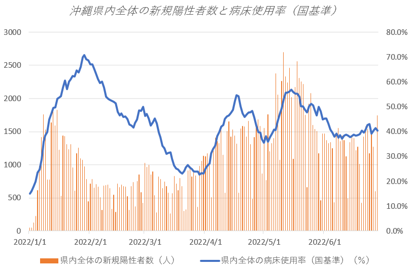 沖縄県内全体の病床使用率(国基準)40.4%。新規PCR検査の陽性率(直近1週間平均)16.9%