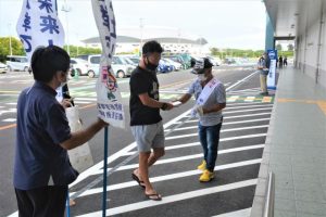 市選挙管理委員会(仲間正人委員長)、市明るい選挙推進協議会(前川尚誼会長)は28日、第26回参議院議員通常選挙の啓発活動をサンエー宮古島シティ前と、タウンプラザかねひでみゃーく平良市場前で行った。参加者が買い物客らにチラシを配布し投票を呼び掛けた。また、マスクやウエットティッシュも手渡し、投票会場における新型コロナウイルス感染予防も促した。